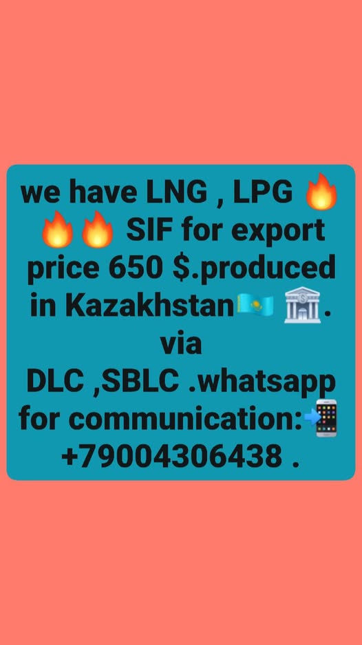we have LNG , LPG 🔥🔥🔥 SIF for export price 650 $.produced in Kazakhstan🇰🇿 🏦. via DLC ,SBLC .whatsapp for communication:📲 +79004306438 .